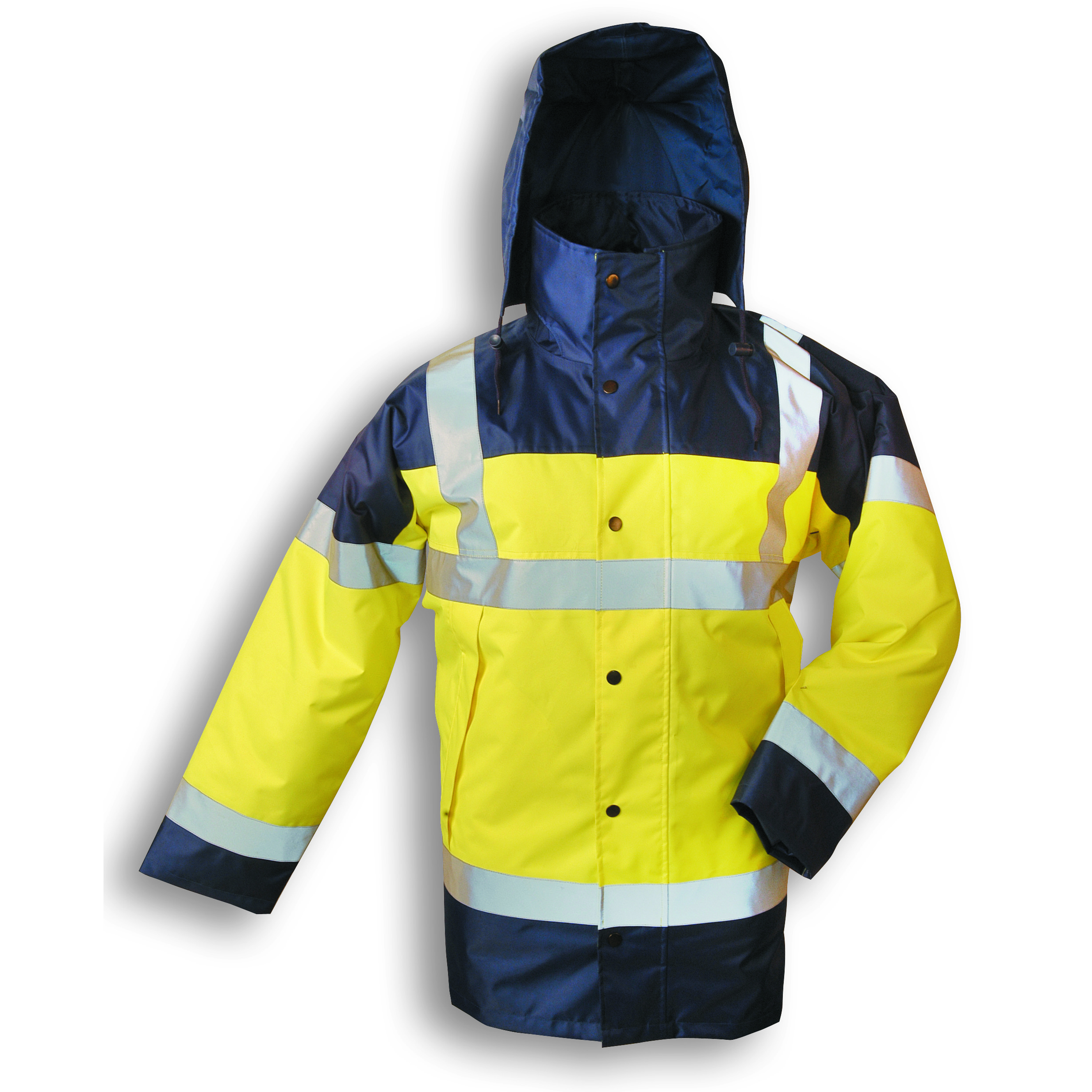 Μπουφάν δίχρωμο μπλε και κίτρινο, από 300D Οxford-Pu με 100% nylon επένδυση,180gr/m² , φερμουάρ YKK και ανακλαστικές ταινίες.