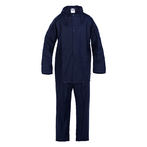 Σετ σακάκι παντελόνι από PVC με επίστρωση PU, σε μπλε χρώμα. Σακάκι με κουκούλα, αεριζόμενη πλάτη, κλείσιμο μπροστά με φερμουάρ και κουμπιά τύπου τρουκ. Παντελόνι με ελαστική μέση.