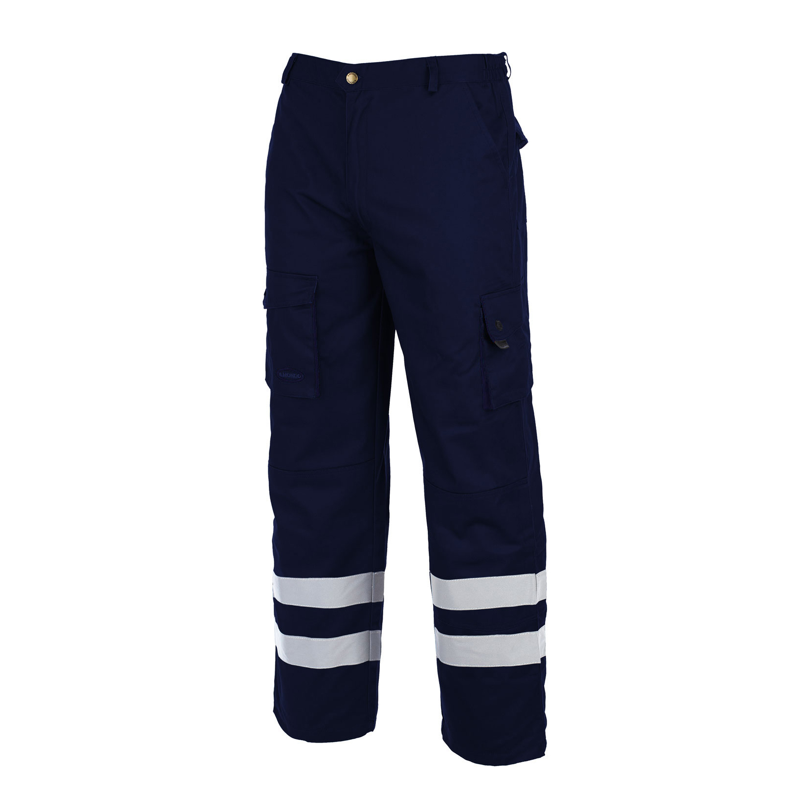 Παντελόνι από 100% βραδύκαυστο βαμβάκι βάρους 270gr/m² με ανακλαστικές ταινίες, με έξι τσέπες, πολύ ανθεκτικό, δύο πλαϊνές, δύο πολυχρηστικές στους μηρούς και δύο πίσω, και θήκες στα γόνατα για επιγονατίδες.