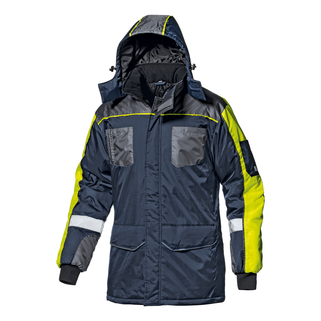 Μπουφάν ανθεκτικό στο κρύο από 100% νάιλον Oxford 420D με επένδυση από Thinsulate 3M 350 g/m². Διαθέτει κρυφό κλείσιμο με φερμουάρ διπλής κατεύθυνσης με κουμπιά, γιακά κλειστό με διπλό Velcro, επένδυση γιακά micro-fleece, τσέπη που κλείνει με Velcro στο αριστερό μανίκι, ελαστικές πλεκτές μανσέτες, αποσπώμενη κουκούλα με επένδυση με κορδόνι περίσφιξης, κορδόνι περίσφιξης στο κάτω μέρος. Φωσφορίζοντα κίτρινα και γκρι ένθετα, δύο τσέπες στο στήθος με Velcro και θήκη για στυλό, δύο κάτω τσέπες με πτερύγιο και Velcro, εσωτερική τσέπη και ανακλαστικές ταινίες.