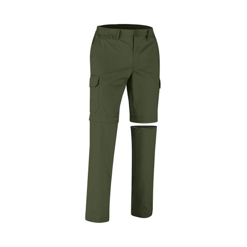 Παντελόνι εργασίας από 65% πολυεστέρα, 35% βαμβάκι, 210 γρ. 2 σε 1 παντελόνι που γίνεται βερμούδα, με αποσπόμενο κομμάτι από το γόνατο και κάτω. Διαθέτει 2 κανονικές τσέπες, 2 πίσω που κλείνουν με καπάκι βέλκρο, 2 πλαινές τσέπες που κλείνουν με βέλκρο.